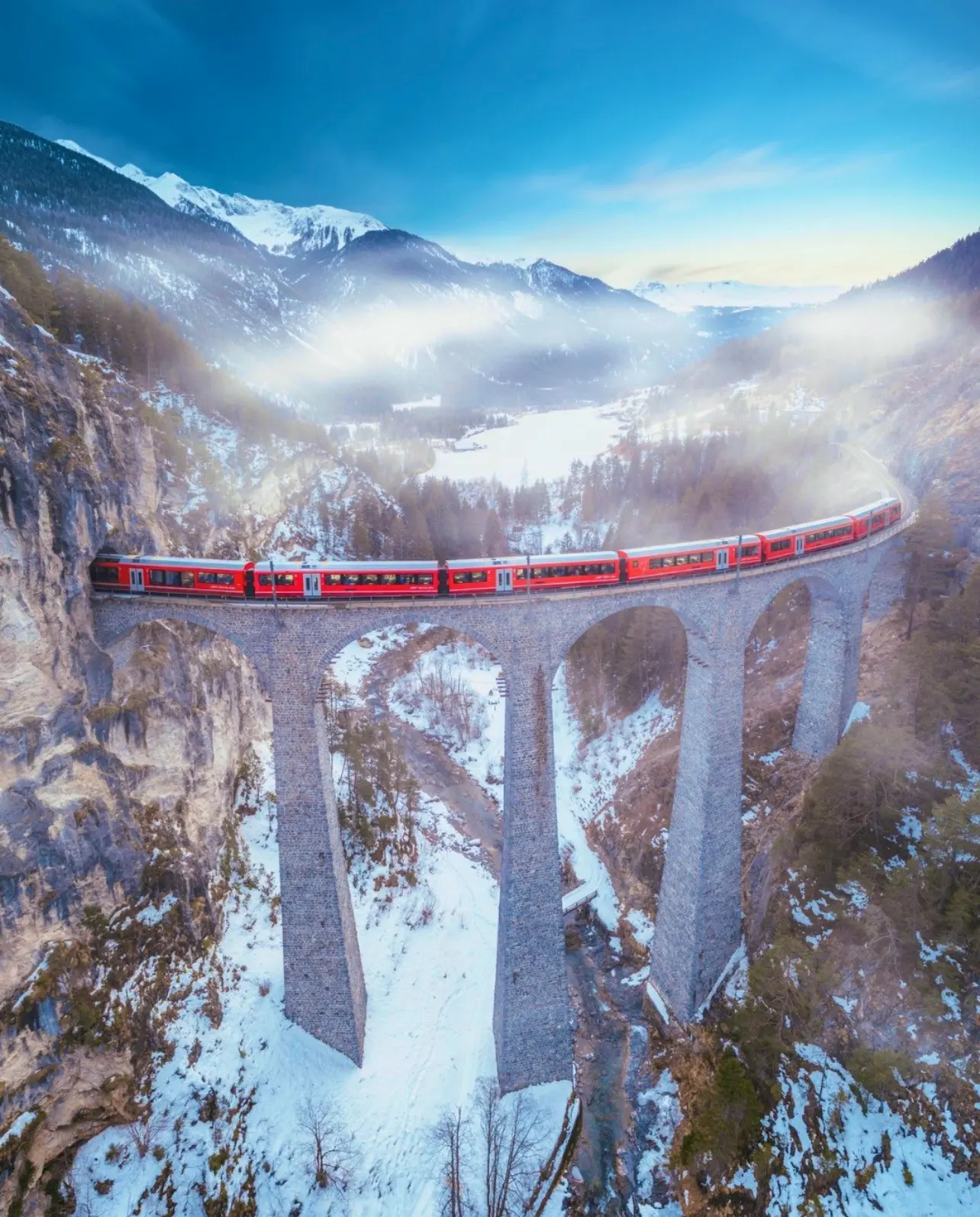 Bernina Express в январе - это сказка: поезд поднимается среди белоснежных горных массивов, мимо сверкающих ледников, озёр и живописных альпийских деревушек. Кажется, будто едешь в зимнюю сказку, где природа и комфорт идеально слились.