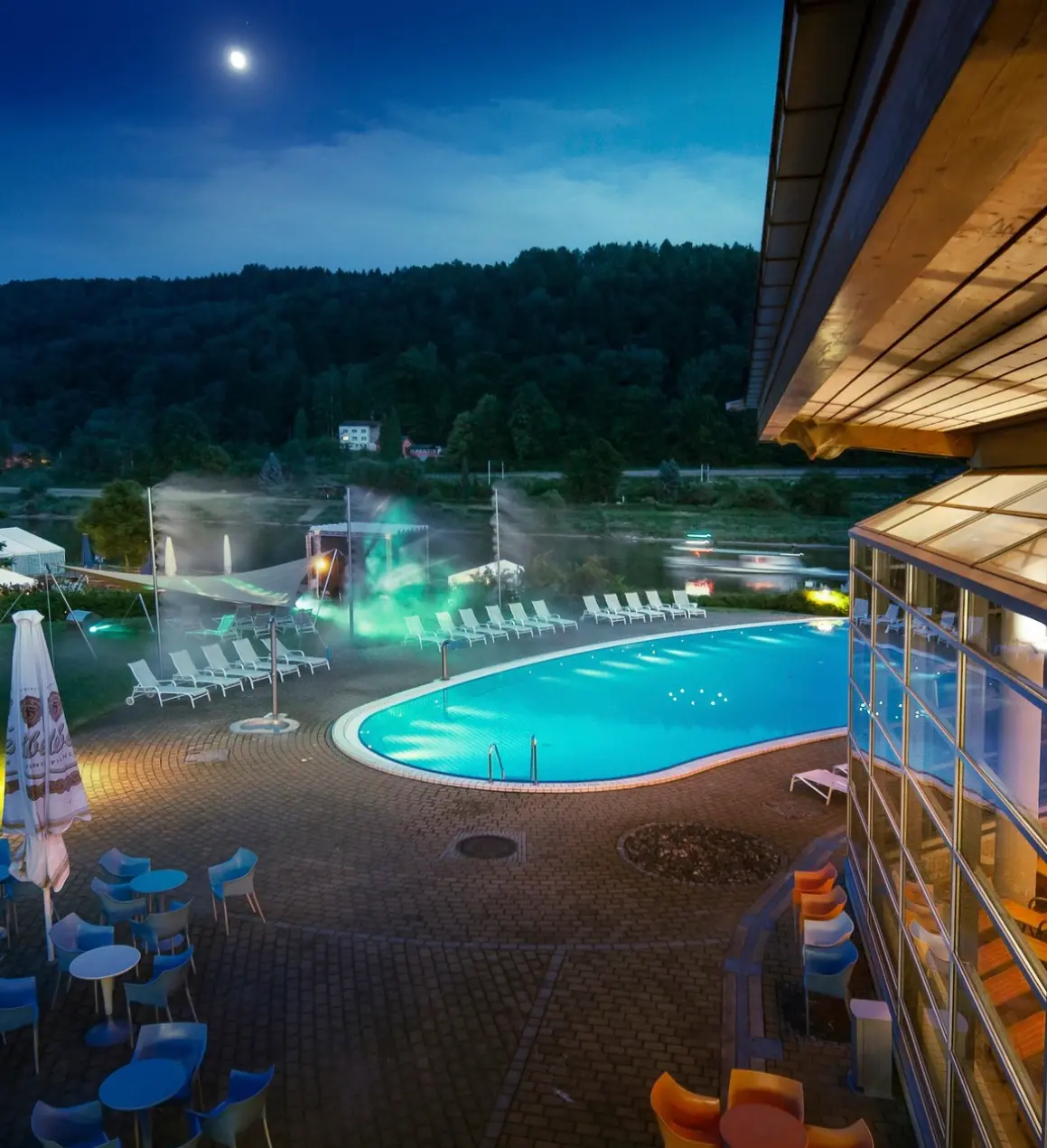 Бассейны с гидромассажем, саун-зона, открытый бассейн с видом на Эльбу и, конечно, жемчужина комплекса - Жидкий звук , бассейн с «жидкой музыкой»: лежите на спине, уши под водой, и музыка словно окружает вас изнутри - полный релакс и необычное ощущение невесомости