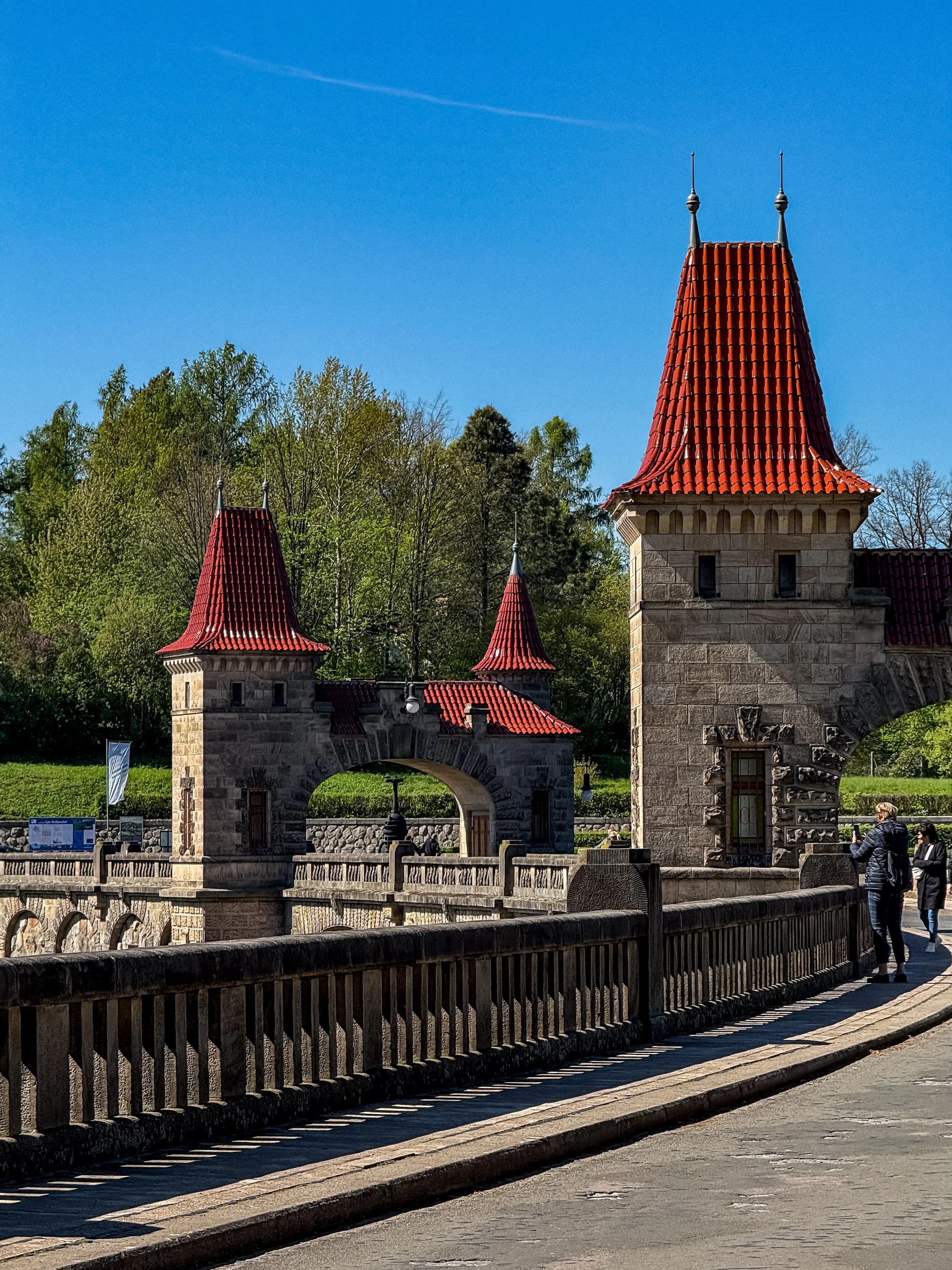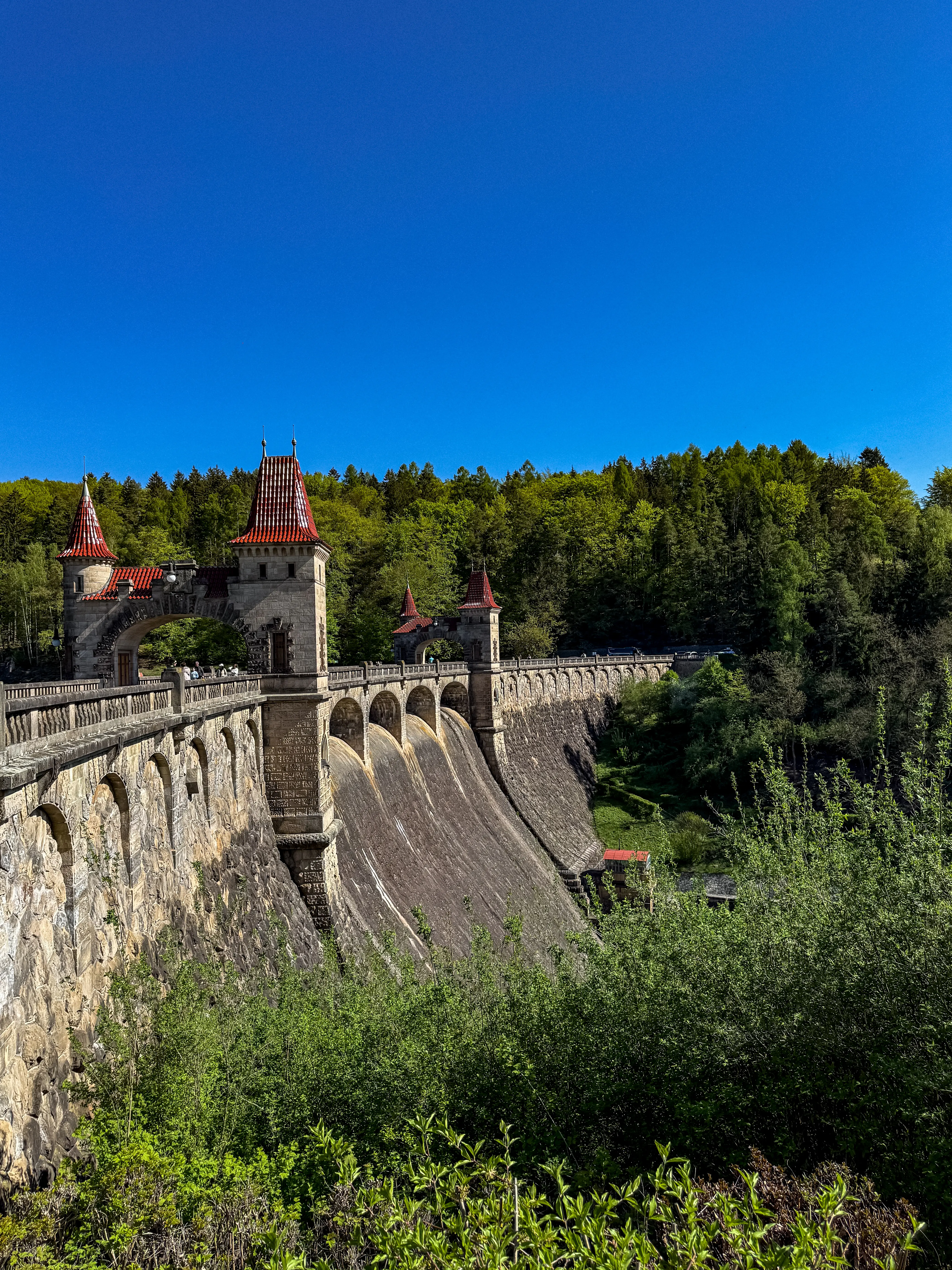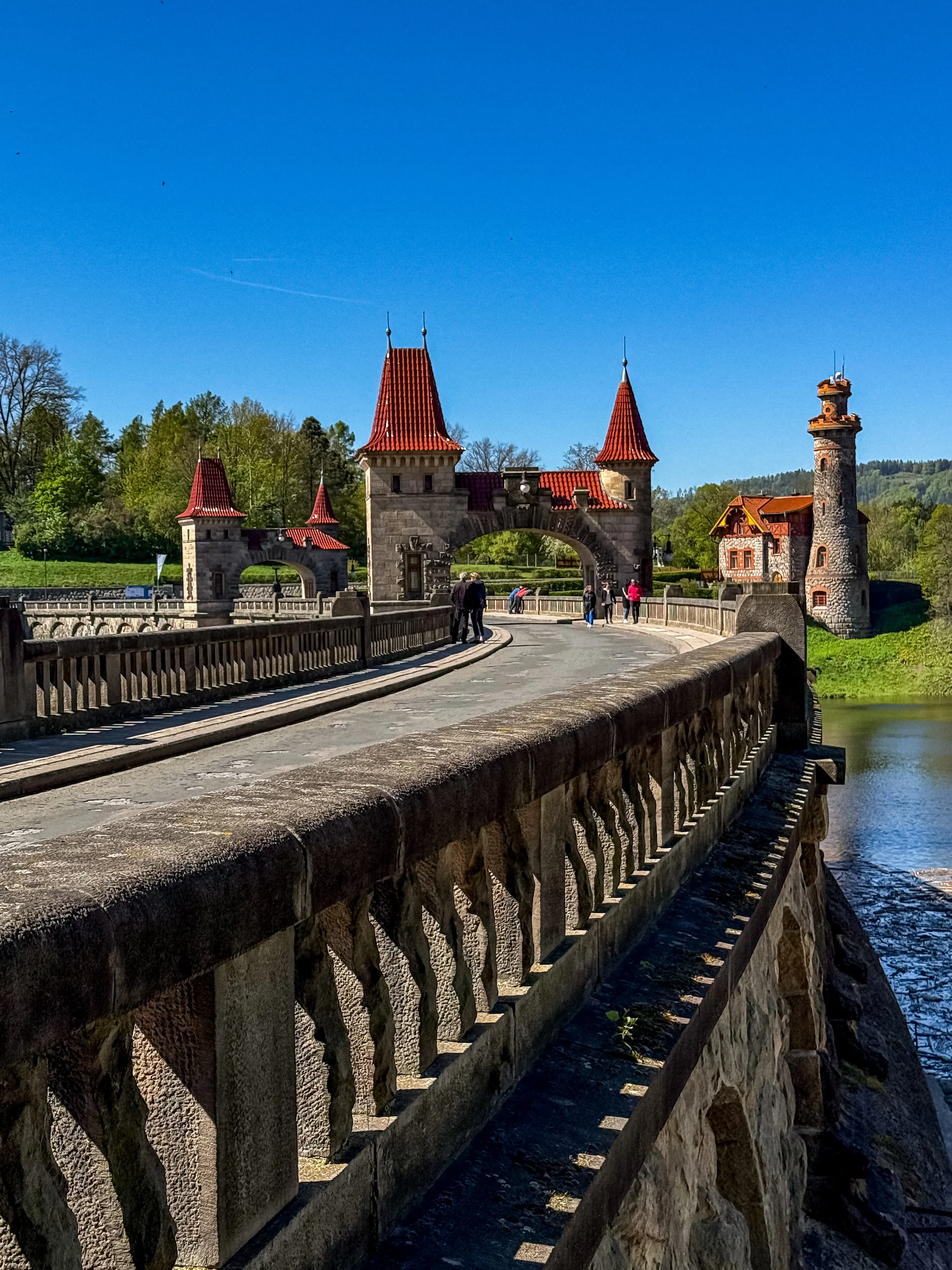 Величественная готическая дамба из розового песчаника - словно сошла со страниц фэнтези-романа. Башенки, арки, отражения в воде - всё выглядит так, будто вот-вот появятся рыцари и драконы.