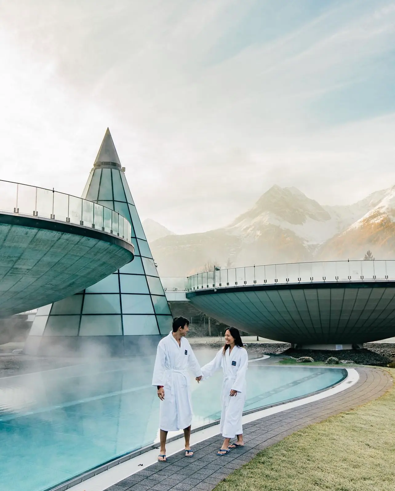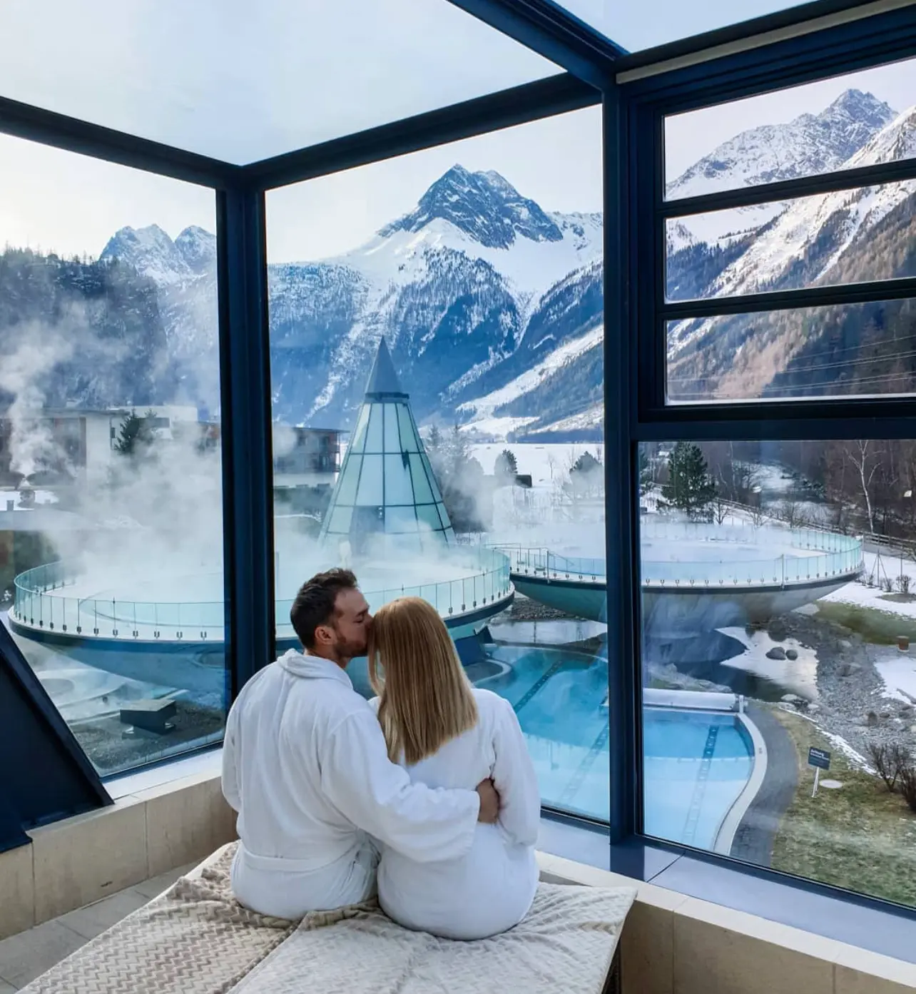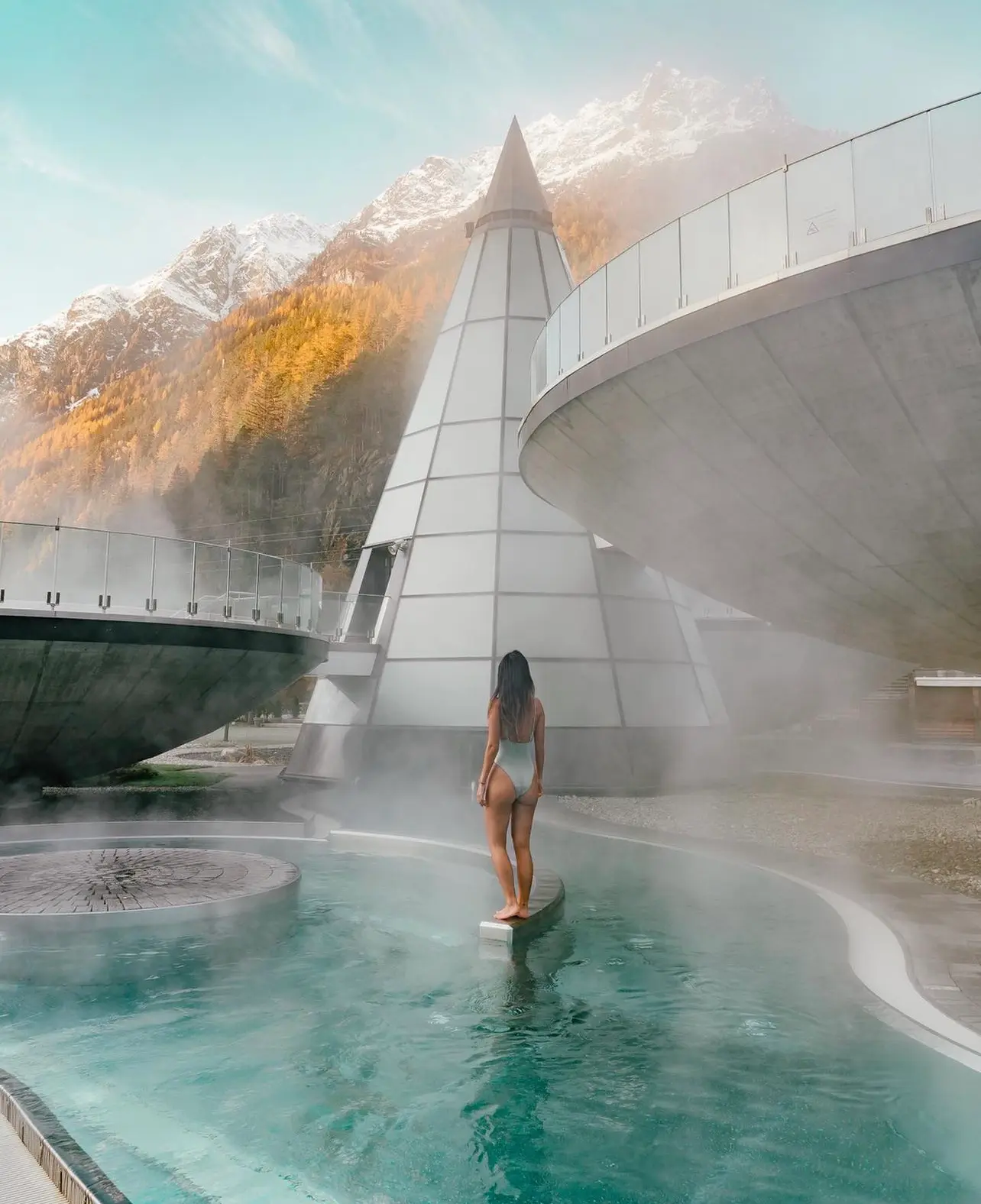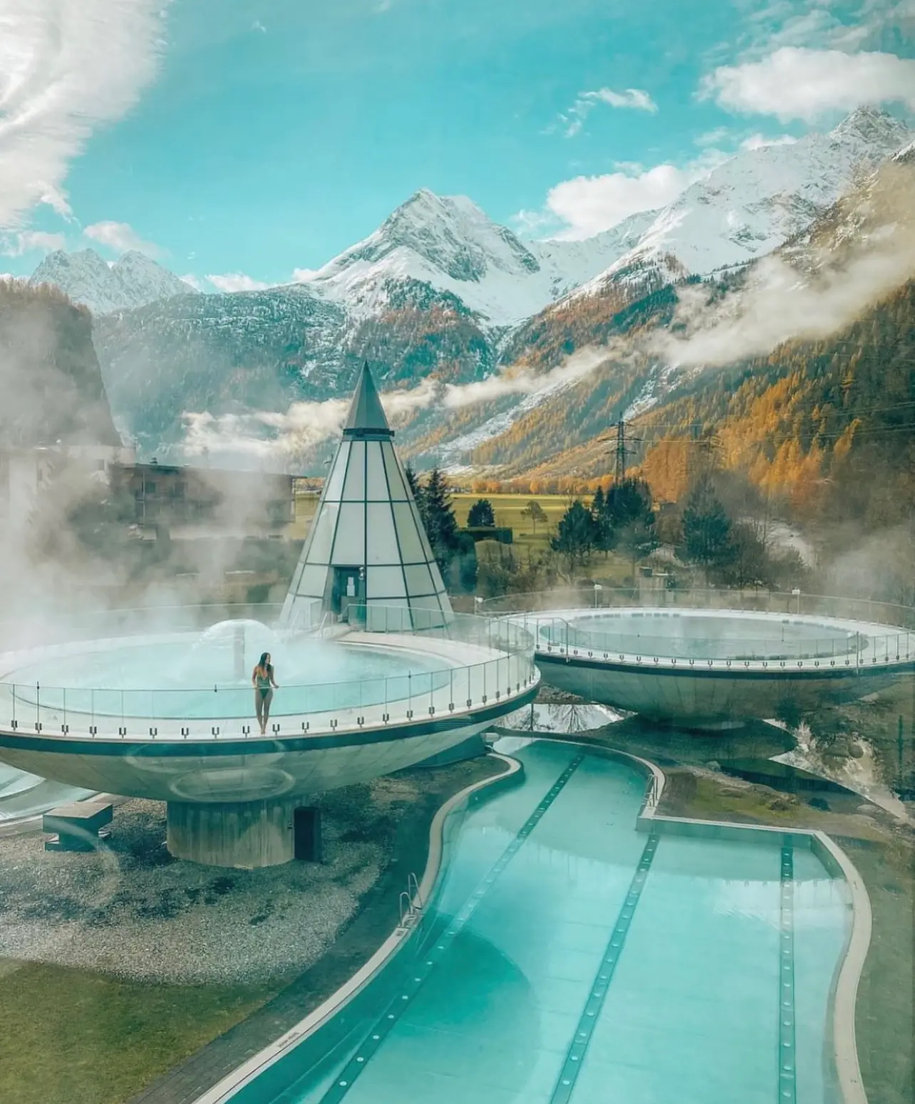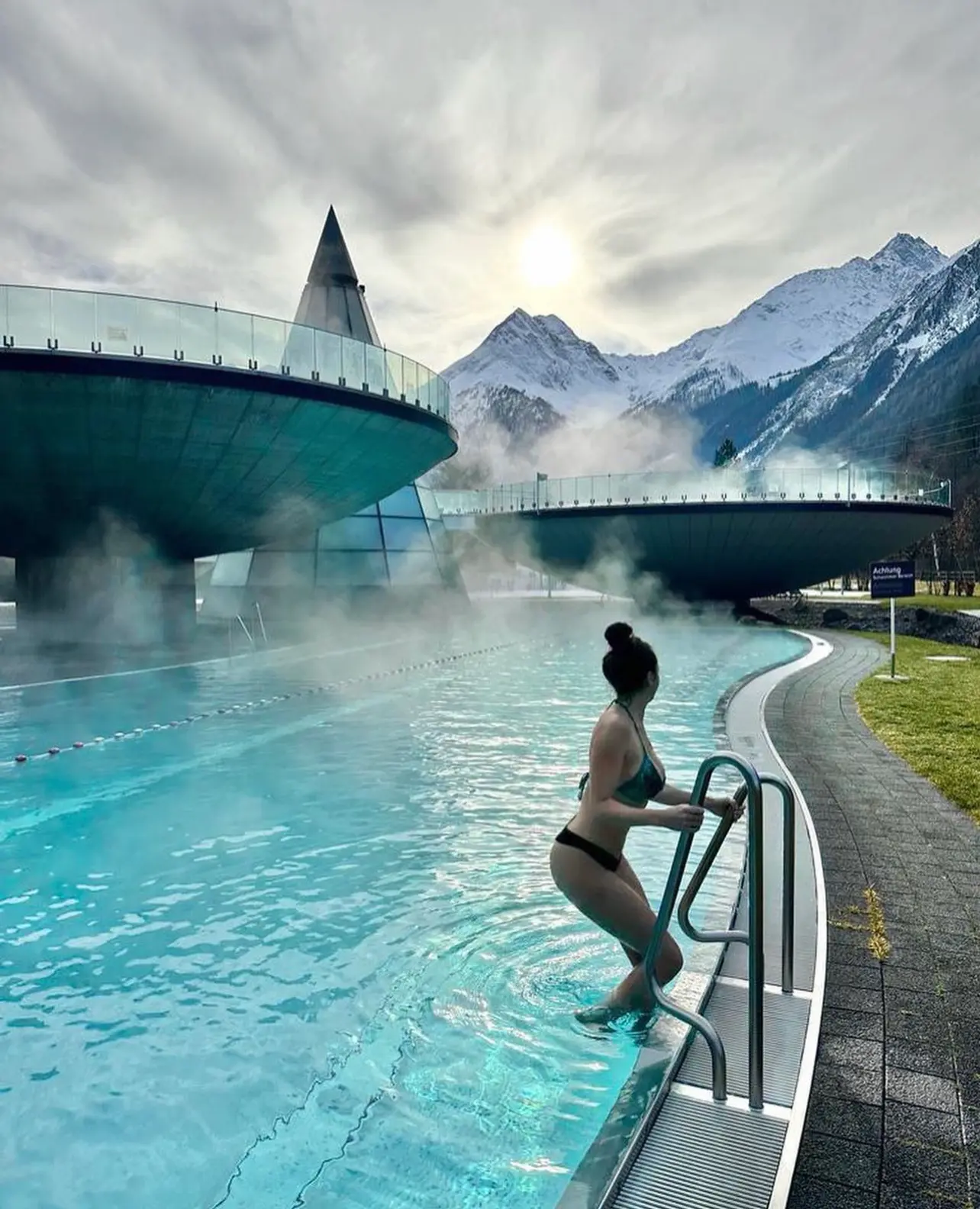 Представьте себе: горячие термальные бассейны под открытым небом, лёгкий пар, морозный альпийский воздух и вокруг - величественные горы.